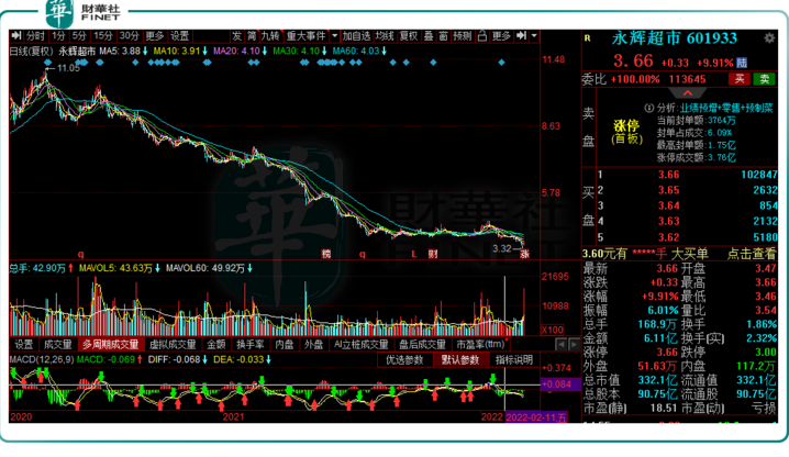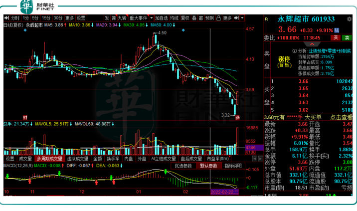 3月9日,永輝超市放量跳空高開,不久便封上漲停板,收報3.66元/股,盤后仍有超10萬手大單牢牢封板。
