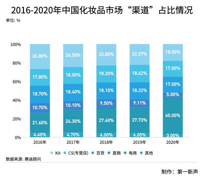 最后,在“場(chǎng)”的層面,過(guò)去很多傳統(tǒng)國(guó)貨美妝都是在線下渠道賣產(chǎn)品,這就存在著兩個(gè)問題,一是至少要經(jīng)歷代理商和門店這兩個(gè)環(huán)節(jié)才能將貨品銷售出去,比線上多了一層的銷售環(huán)節(jié),這就加大了各個(gè)環(huán)節(jié)的運(yùn)營(yíng)成本,導(dǎo)致線下產(chǎn)品價(jià)格比線上高,銷售量下降,各品牌逐漸轉(zhuǎn)移到電商平臺(tái)。