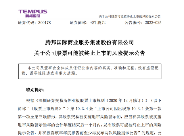 最先敲響警鐘的是上市第12個年頭的騰邦國際。因2020年度審計報告為“無法表示意見”,該公司于去年5月戴上了“*ST”帽子,現(xiàn)在的股票名稱為*ST騰邦。截至發(fā)稿,*ST騰邦已公開發(fā)布了兩次公司股票終止上市的風(fēng)險警示。