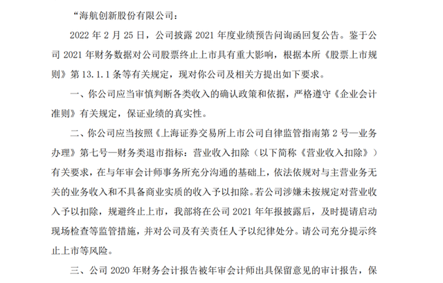 然而,就在業(yè)績預(yù)告發(fā)布后不久,*ST海創(chuàng)(海航創(chuàng)新股份有限公司)就收到了上交所的《監(jiān)管工作函》。上交所要求*ST海創(chuàng)按照第七號—財務(wù)類退市指標:營業(yè)收入扣除的有關(guān)要求,在與年審會計師事務(wù)所充分溝通的基礎(chǔ)上,依法依規(guī)對與主營業(yè)務(wù)無關(guān)的業(yè)務(wù)收入和不具備商業(yè)實質(zhì)的收入予以扣除。若公司涉嫌未按規(guī)定對營業(yè)收入予以扣除,規(guī)避終止上市,上交所將在公司2021年年報披露后,及時提請啟動現(xiàn)場檢查等監(jiān)管措施,并對公司及有關(guān)責(zé)任人予以紀律處分。