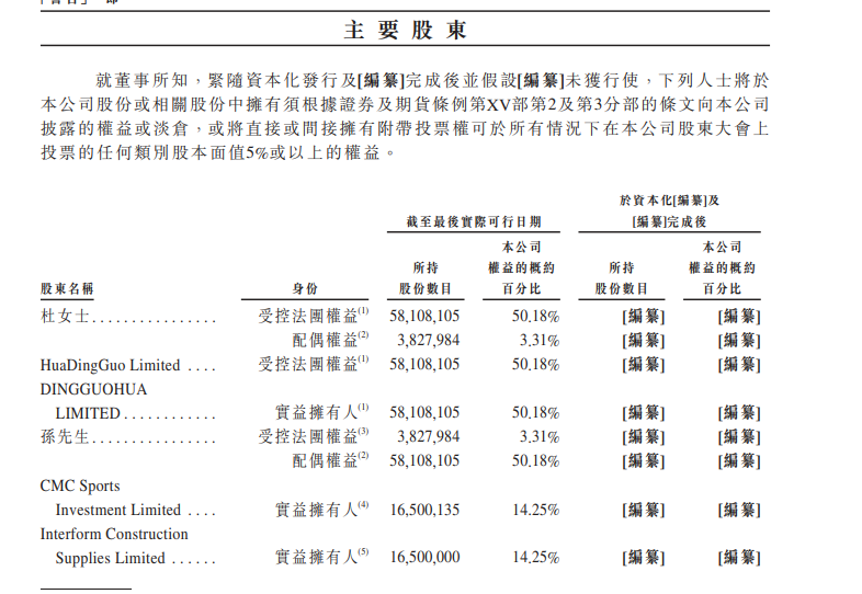 上市之前,公司創(chuàng)辦人兼董事長杜華持股50.18%,阿里影業(yè)通過Interform Construction Supplies Limited持股14.25%,字節(jié)跳動旗下公司量子躍動通過Afflatus Limited持股4.74%,華人文化通過CMC Sports Investment Limited持股14.25%。