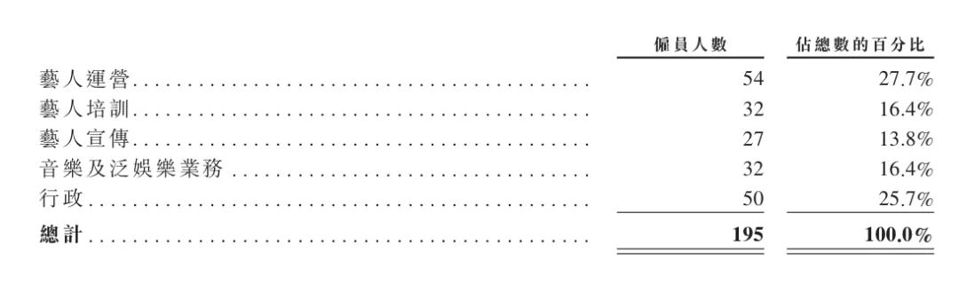 招股書顯示,195名員工中,負責藝人運營員工數(shù)54人;負責藝人培訓員工數(shù)32人;負責藝人宣傳員工數(shù)27人;負責音樂及泛娛樂業(yè)務(wù)員工數(shù)32人;行政方面員工數(shù)50人。