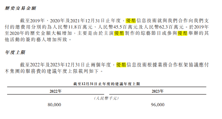招股書還顯示,截至2019年、2020年及2021年12月31日止,優(yōu)酷向樂華娛樂支付總費用分別為1180萬元、4500萬元及6230萬元,三年共計約1.2億元。并且截至2022年及2023年12月31日兩年度,優(yōu)酷根據(jù)業(yè)務(wù)合作框架協(xié)議應(yīng)支付樂華集團的服務(wù)費建議年度上限分別為8000萬元及9600萬元。