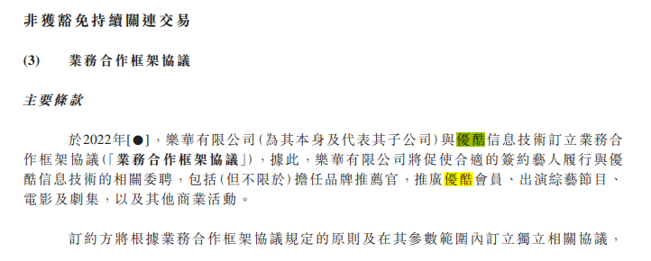 根據(jù)優(yōu)酷與樂華娛樂雙方簽訂的合作框架協(xié)議,樂華娛樂將安排合適的簽約藝人履行與優(yōu)酷的相關(guān)委聘。包括擔任品牌推薦官、推廣會員、出演綜藝節(jié)目、電影及劇集,以及其他商業(yè)活動等。
