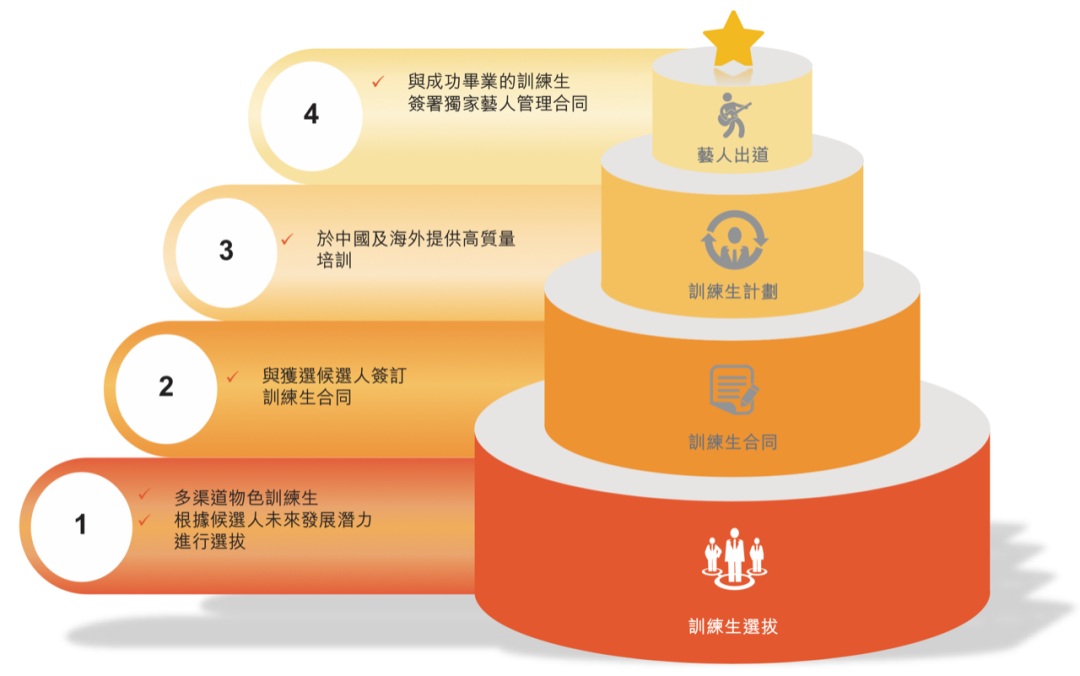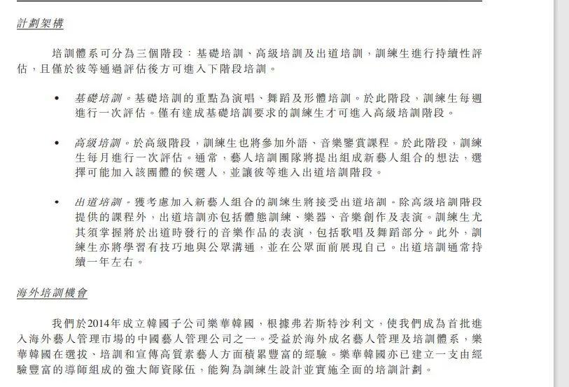 樂華娛樂表示,公司選拔訓練生主要于國內(nèi)并且通過線上、線下多渠道進行。截至2021年12月31日,公司已與30家藝術(shù)院校以及藝術(shù)培訓機構(gòu)合作,于校內(nèi)外舉辦訓練生選拔活動。此外,公司也接受個人在線申請并通過社交平臺推薦發(fā)掘潛在候選人。
