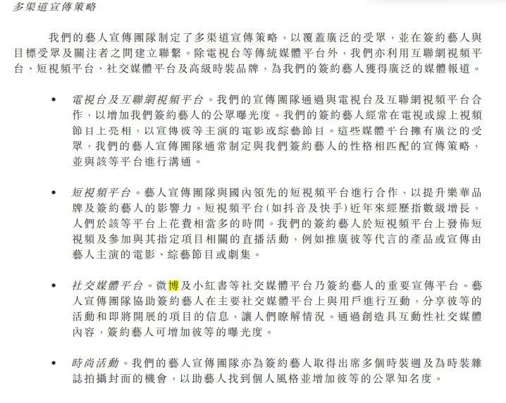 招股書表示,藝人宣傳團是建立藝人與觀眾溝通橋梁的關(guān)鍵環(huán)節(jié)。宣傳團隊通過發(fā)布宣傳材料來幫助藝人增加曝光率,以及在社交平臺上發(fā)布與藝人有關(guān)的新聞、動態(tài)等。若簽約藝人面臨潛在不利宣傳,藝人宣傳團隊還要及時作出反應(yīng)并制定適當回應(yīng)。