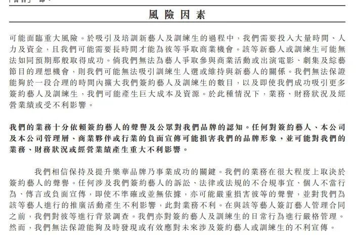 第二,藝人的聲譽和公眾對公司的品牌認知非常重要。樂華娛樂在招股書中表示,公司業(yè)務(wù)很大程度上取決于簽約藝人的聲譽。任何涉及簽約藝人的訴訟、法律或者法規(guī)的不合規(guī)事宜、個人不當行為、傳言或者負面宣傳,即使不準確或者沒有依據(jù),仍然可能嚴重損害藝人聲譽。同時也對公司業(yè)務(wù)產(chǎn)生不利影響。