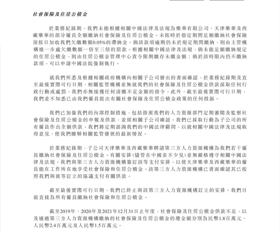 招股書透露公司未根據(jù)相關(guān)法律法規(guī)為樂華有限公司、天津樂華以及西藏樂華的部分員工全額繳納社保及住房公積金。子公司天津樂華和西藏樂華聘請的第三方人力資源機構(gòu)負責相關(guān)事宜,但其并未遵守規(guī)定。
