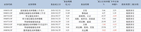Wind 數(shù)據(jù)顯示,目前市面上共有8只股票多空類型的量化對(duì)沖基金。其中,規(guī)模最大的兩只分別為富國(guó)量化對(duì)沖策略、景順長(zhǎng)城量化對(duì)沖,兩者均為三個(gè)月定開的基金。從業(yè)績(jī)來(lái)看,8只量化對(duì)沖策略基金有5只在今年以來(lái)保住了正收益,華寶量化對(duì)沖、中金匯越量化對(duì)沖策略、德邦量化對(duì)沖策略3只基金跌幅均控制在1%以內(nèi)。