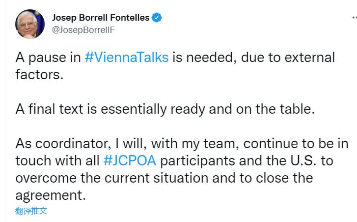 上周五,歐盟外交與安全政策高級代表博雷利宣布由于“外部因素”,維也納談判需要暫停。目前代表們已經(jīng)返回各自國家,談判何時重啟尚不得知。