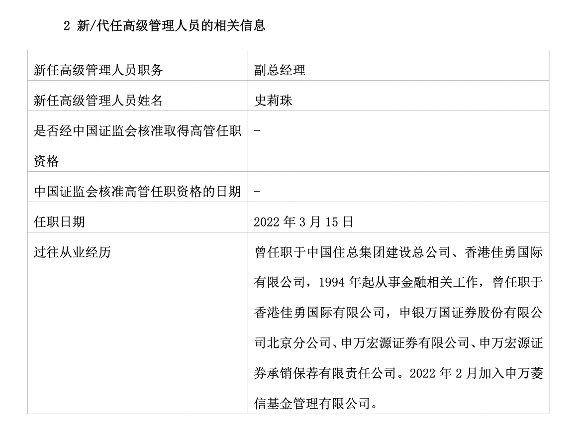 資料顯示,史莉珠曾任職于中國住總集團(tuán)建設(shè)總公司、香港佳勇國際有限公司,1994年起從事金融相關(guān)工作,曾任職于香港佳勇國際有限公司,申銀萬國證券股份有限公司北京分公司、申萬宏源證券有限公司、申萬宏源證券承銷保薦有限責(zé)任公司。2022年2月加入申萬菱信基金。
