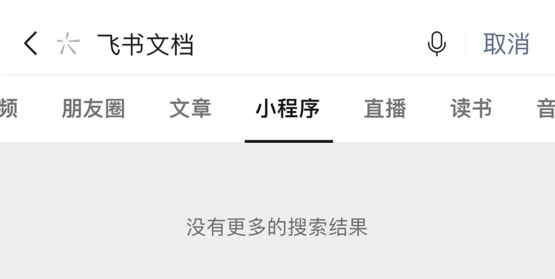 經(jīng)驗(yàn)證,目前,在微信上搜索“飛書文檔”小程序,仍顯示“沒有更多搜索結(jié)果”。