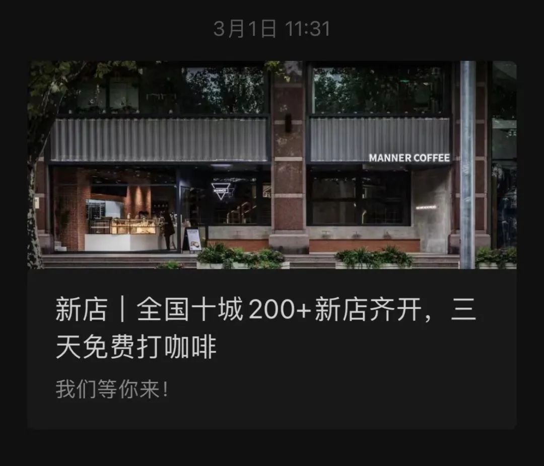 以代表選手Manner為例。3月1日,其在官方微信公眾號(hào)發(fā)布公告稱,將于3月8日到3月10日期間,在上海、北京、武漢、成都、南寧、海口、深圳、蘇州、杭州和重慶10個(gè)城市齊開(kāi)200多加新店。