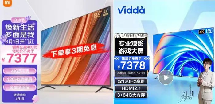 2022年3月,電商女神節(jié)促銷期間,小米R(shí)edmi MAX 86降至7377元?dú)v史最低價(jià);3月4日,Vidda 85V1F-S緊跟著標(biāo)出7378元價(jià)簽?;蛟S是受到了一元競(jìng)價(jià)的刺激,3月7日,Redmi MAX 86突然狂降至6999元,巨屏電視價(jià)格低至7千元以下,可以說(shuō)是“砸穿了地板”。