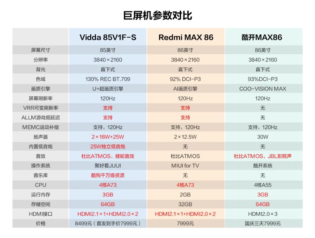 音響配置方面,Vidda 85V1F-S配備了雙18W揚(yáng)聲器和25W獨(dú)立揚(yáng)聲器,Redmi Max 86只配了雙12.5W揚(yáng)聲器;硬件性能方面, Vidda 85V1F-S配備了4核A73芯片和3GB+64GB內(nèi)存,Redmi Max 86同樣的芯片只配備了2GB+32GB內(nèi)存。
