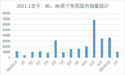 奧維云網(wǎng)數(shù)據(jù)顯示,2021年下半年,86/85英寸電視銷量逐漸上升并在11月份迎來(lái)銷量小高峰,銷量接近7萬(wàn)臺(tái)。在均價(jià)方面,86/85英寸電視從2021年11月份起跌破萬(wàn)元,預(yù)計(jì)下調(diào)超3400元。