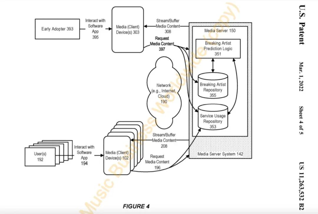在專利說明摘要中,Spotify將這項(xiàng)專利稱為“在流媒體環(huán)境中預(yù)測(cè)潛力音樂人的系統(tǒng)和方法”.至于何為“流媒體環(huán)境”,Spotify進(jìn)一步補(bǔ)充道,系統(tǒng)數(shù)據(jù)將來源于多個(gè)流媒體平臺(tái)。不過具體應(yīng)用時(shí)將涉及哪些音樂流媒體平臺(tái),目前尚未可知。