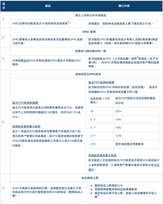 不過,為避免制度過于繁瑣,提高本港SPAC制度的靈活性和吸引力,提高上市效率,港交所在正式文件中對(duì)上市規(guī)則做了微調(diào),放松了一些規(guī)定,包括降低機(jī)構(gòu)投資者人數(shù)要求,取消投票與贖回一致的要求等。