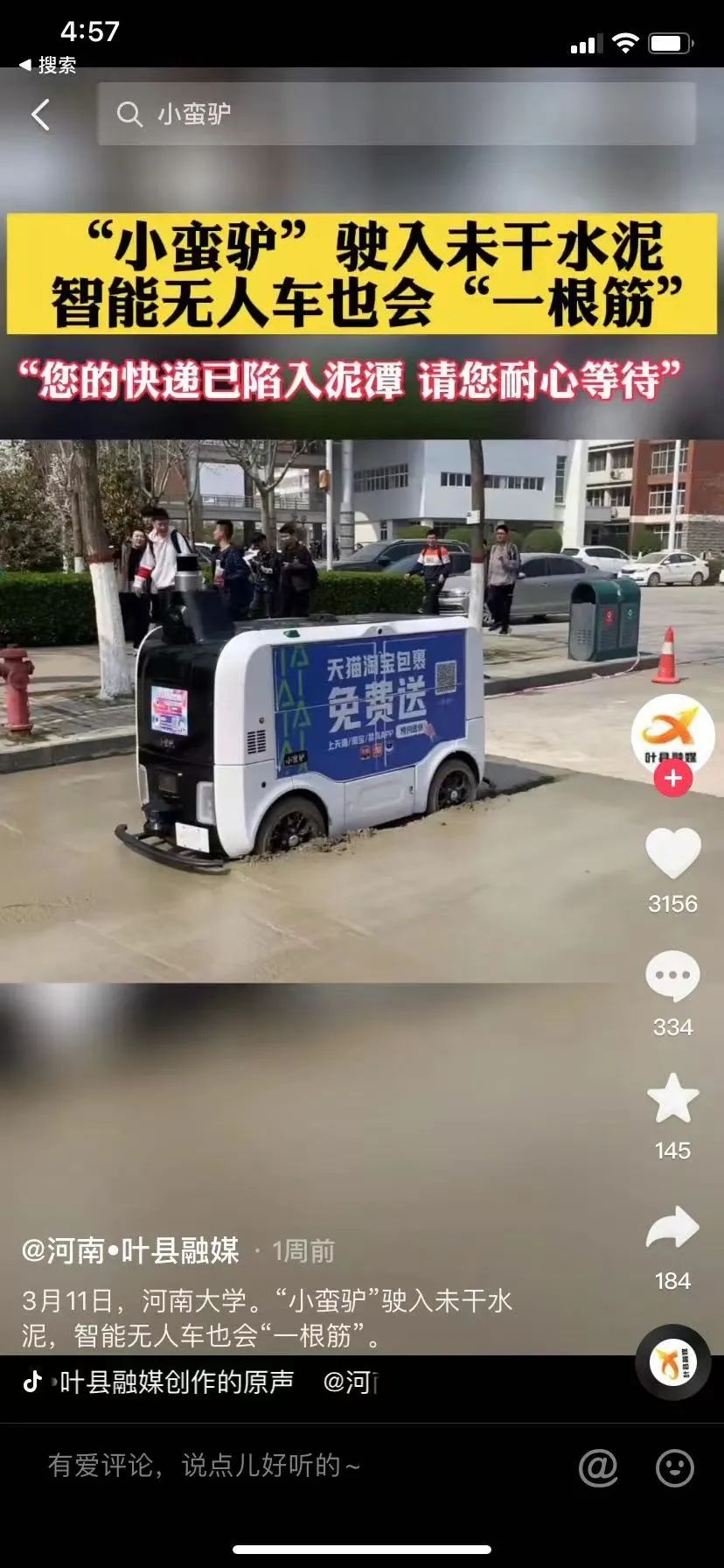 在河南大學(xué)校園中,阿里用于無(wú)人配送的“小蠻驢”近日不幸駛?cè)肓艘黄┕げ痪玫奈锤伤嗟兀⑸钕萜渲?,引發(fā)學(xué)生們圍觀和哄笑。