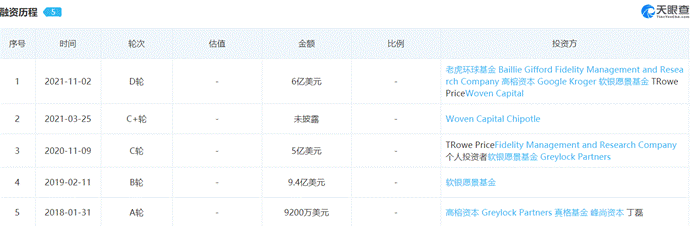 目前這位玩家與沃爾瑪、克羅格、達(dá)美樂(lè)披薩等行業(yè)巨頭合作,日常配送食品、飲料、藥品和其他產(chǎn)品,據(jù)天眼查APP顯示,Nuro去年11月2日獲得行業(yè)內(nèi)首次D輪融資,隨后估值攀升到了 86 億美元,甚至超過(guò)國(guó)內(nèi)Robotaxi一眾獨(dú)角獸。