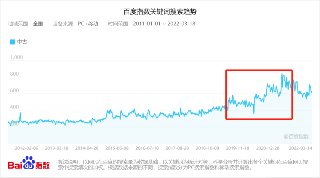 百度指數(shù)顯示,“中古”一詞的搜索趨勢在近兩年攀升