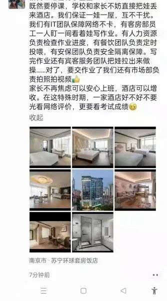 最先找出這一“商機”的是南京蘇寧環(huán)球套房酒店。2022年3月16日起,南京全市中小學暫停線下教學。當天下午,酒店便發(fā)出了一條朋友圈:“我們有IT團隊保障網(wǎng)絡(luò)不卡,有客房部員工一人盯一間看著娃寫作業(yè);有人力資源負責檢查作業(yè)進度,有餐飲團隊負責定時‘投喂’,有安保團隊負責安全隔離保障;寫完作業(yè)還有賓客服務(wù)團隊把娃拉出來做操……對了,要交作業(yè)了我們還有市場部負責拍照、拍視頻?!?/p>