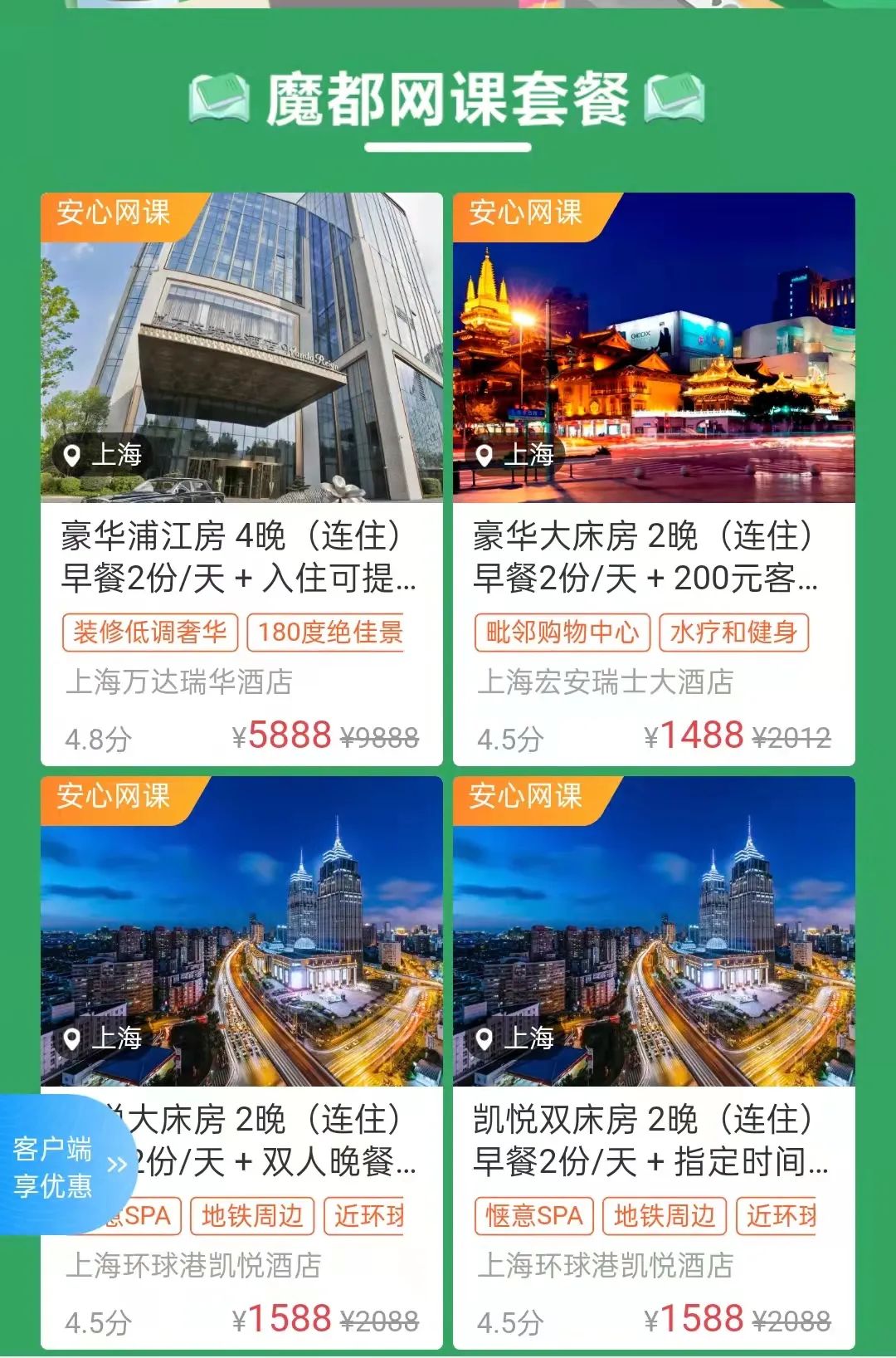 同期,“攜程無憂網(wǎng)課房”活動在攜程App悄然上線,上海地區(qū)的21家高星酒店的34個套房參與活動,價格在588元到11664元之間。從活動界面中可以看出,雖然提供了各式各樣的附加服務(wù),但參與活動的酒店大多提供了力度較大的價格優(yōu)惠,減免金額從幾百元到兩千多元不等,優(yōu)惠力度高達60%?!斑@類房間都是預(yù)售,加之現(xiàn)在疫情因素影響,其實比正常時期的客房價格還要便宜。”攜程研究院戰(zhàn)略研究中心副主任張致寧對新旅界(LvJieMedia)表示。