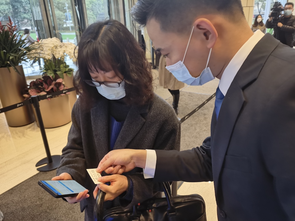 隨后,白領(lǐng)們來到大堂內(nèi)的健康碼檢測(cè)區(qū)域,在出示健康碼后,商務(wù)樓工作人員們還仔細(xì)查看每一位的檢測(cè)陰性報(bào)告日期和相關(guān)結(jié)果。在全部核驗(yàn)完成的情況下,工作人員會(huì)向大家發(fā)放一張上海恒隆廣場當(dāng)日的臨時(shí)出入證。