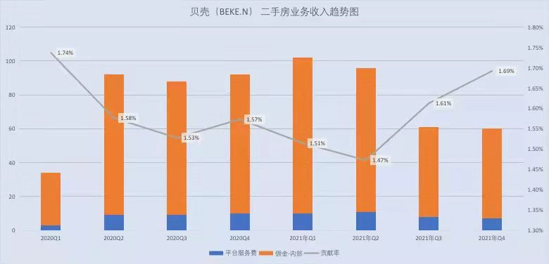 財(cái)報(bào)顯示,2021 年四季度,二手房屋交易服務(wù)的凈收入為 60 億元,GTV 同比降幅高達(dá) 39.4%。