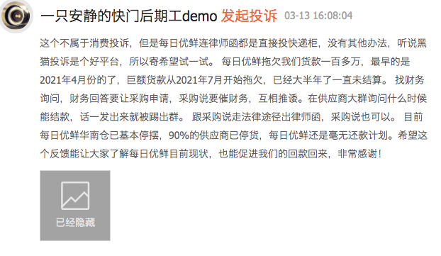 3月13日,在黑貓投訴上,也有一位網(wǎng)友發(fā)起投訴,稱“每日優(yōu)鮮拖欠巨額貨款大半年了”,投訴涉及的金額為110萬元。