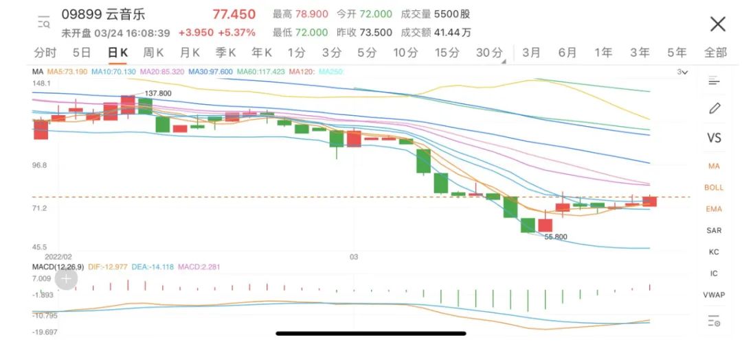 網(wǎng)易云音樂上市之初,就把自己包裝成“全球最大的音樂社區(qū)”,首發(fā)價(jià)為205港元,現(xiàn)在價(jià)格為77.45港元,不到4個(gè)月時(shí)間股價(jià)降幅高達(dá)62.2%!最低時(shí)價(jià)格僅為55.8港元,由此可見,資本對丁磊的音樂情懷并不是很認(rèn)可。