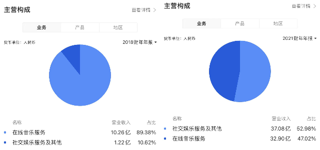 營收構(gòu)成方面,社交娛樂服務(wù)收入板塊逐漸成為主力,這個(gè)源于其在“音樂社區(qū)”方面的持續(xù)發(fā)力。社交娛樂服務(wù)及其他收入由2020年的23億元增加63.1%至2021年的37億元,當(dāng)中絕大部分來自直播服務(wù)。在線音樂服務(wù)收入由2020年的26億元增加25.4%至2021年的33億元,主要由于會員訂閱銷售收入大幅增長。