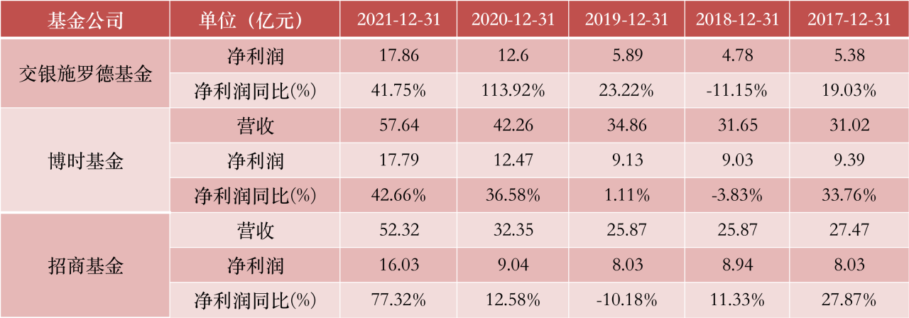 3月27日晚間,招商證券(600999.SH)和此前已披露的交通銀行(601328.SH)的年報顯示,旗下博時基金、招商基金和交銀施羅德,2021年分別賺了17.79億元、16.03億元和17.86億元。