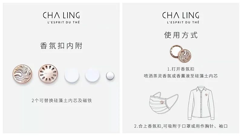 同樣十分流行的還有香氛扣,這種產(chǎn)品中有棉片等擴(kuò)香物,滴入香氛精油后,可以通過自身的磁石吸附在其他物品上。如電子設(shè)備品牌Bone推出了精油香氛磁扣;珠寶品牌FloJewllery的香氛扣中的擴(kuò)香石可以清洗后再次使用;美妝品牌茶靈的香氛扣帶有可替換硅藻土內(nèi)芯。