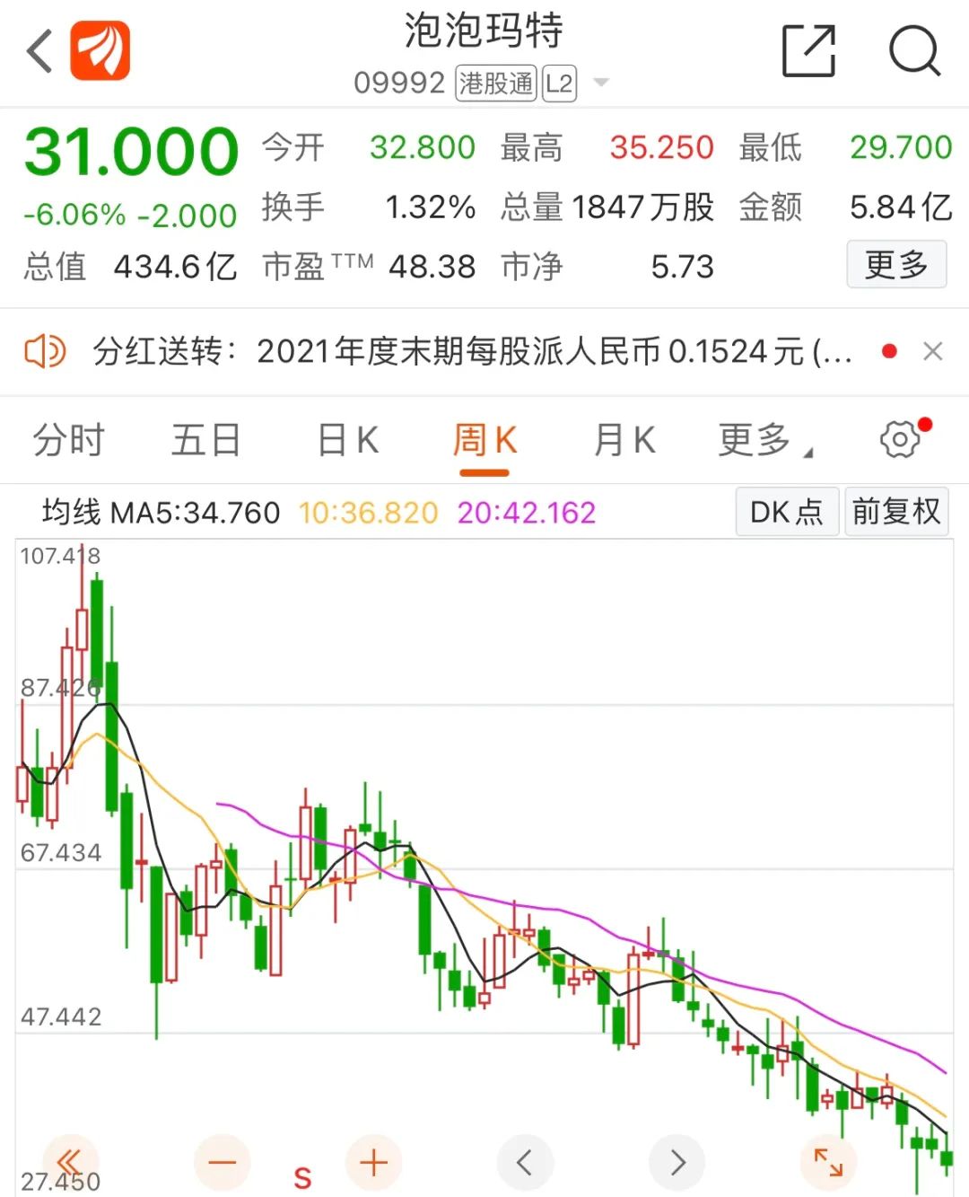 不過(guò),泡泡瑪特財(cái)報(bào)發(fā)布后,公司股價(jià)跳水,從早盤的漲近7%轉(zhuǎn)跌,盤中跌幅一度超過(guò)10%。截至今日收盤,泡泡瑪特報(bào)31港元/股,跌幅6.06%,市值434.6億港元,距泡泡瑪特巔峰時(shí)總市值已跌去七成多。
