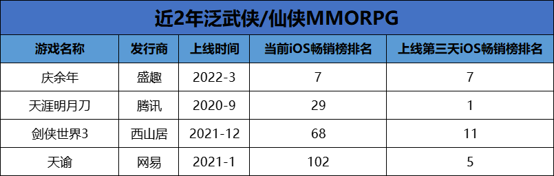 從市場(chǎng)格局來(lái)看:頂級(jí)大廠與品類(lèi)老牌廠商的對(duì)決。根據(jù)DataEye研究院整理顯示,目前暢銷(xiāo)榜TOP100中,近2年推出泛武俠MMORPG產(chǎn)品屈指可數(shù)。