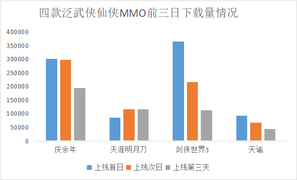 21年底上線(xiàn)的《劍俠世界3》在首日獲得超過(guò)36萬(wàn)次下載,排名其余三款同類(lèi)型題材之首,不過(guò)下載量在次日和第三日出現(xiàn)明顯下滑。作為對(duì)比,《慶余年》上線(xiàn)三天的總量不僅排名第一,而且整體下載量穩(wěn)定,即使是第三天出現(xiàn)回落也領(lǐng)先同類(lèi)型產(chǎn)品。