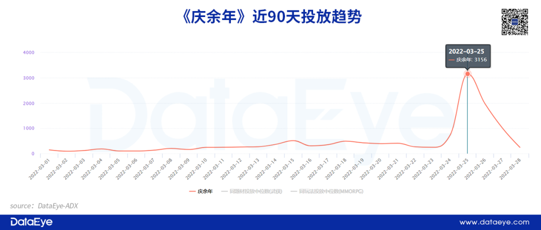 上線(xiàn)初期投放趨勢(shì):用較長(zhǎng)預(yù)熱鋪墊搶奪注意力。根據(jù)DataEye-ADX數(shù)據(jù)顯示,《慶余年》在2月中旬以日均200余組的效果廣告進(jìn)行產(chǎn)品的預(yù)熱,在游戲上線(xiàn)前一天,投放量便上升到700余組。而在游戲上線(xiàn)當(dāng)天,項(xiàng)目組單日超過(guò)3000組素材進(jìn)行投放,試圖爭(zhēng)奪用戶(hù)注意力。