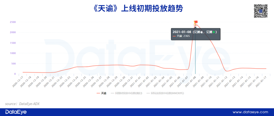 《天諭》在預(yù)熱階段采用了大致相同的投放策略,游戲上線(xiàn)前夕,項(xiàng)目組以日均300余組的效果廣告進(jìn)行宣傳推廣,但預(yù)熱時(shí)間較短,大約只有半個(gè)月時(shí)間。對(duì)比《慶余年》,《天諭》或許因?yàn)槠涠擞萎a(chǎn)品具有一定的名氣,沒(méi)必要進(jìn)行過(guò)長(zhǎng)的預(yù)熱投放。