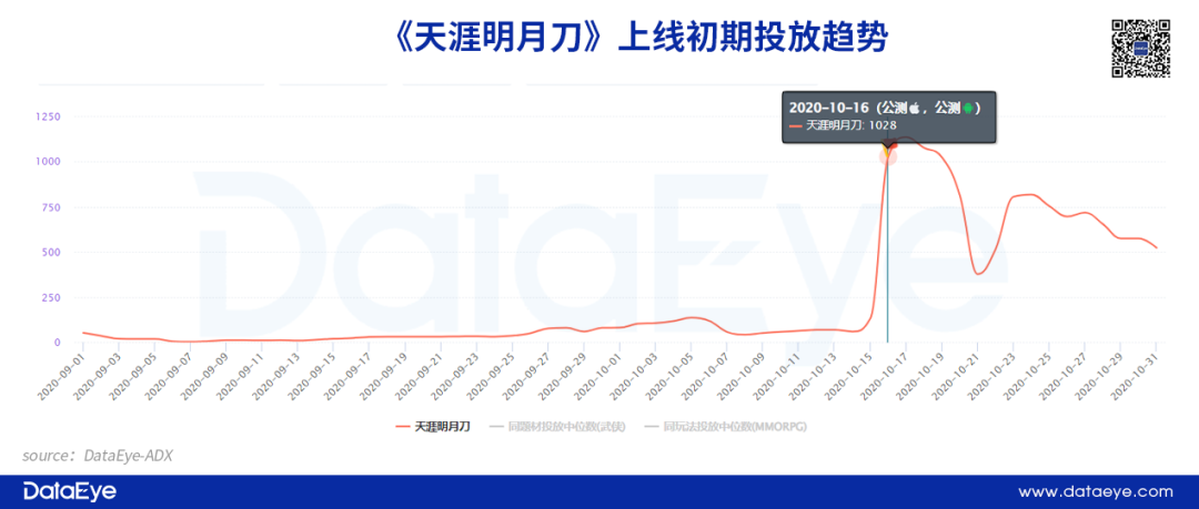 相比之下,騰訊《天刀》在產(chǎn)品預(yù)熱階段的投放力度更低,游戲上線(xiàn)前一個(gè)月日均投放量不足百組??墒窃谟螒蛏暇€(xiàn)后,單日投放超過(guò)1000組,并且后續(xù)投放相對(duì)穩(wěn)定。