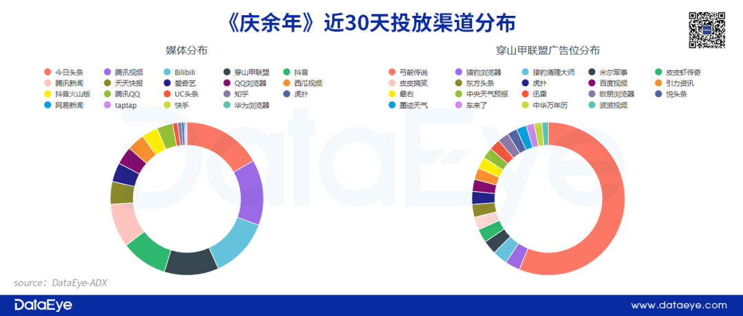 從投放渠道來(lái)看:B站成為重點(diǎn)投放渠道。根據(jù)DataEye-ADX數(shù)據(jù)顯示,近30天《慶余年》投放TOP3渠道分別是:今日頭條、騰訊視頻以及BiliBili。對(duì)比其他產(chǎn)品,《慶余年》加大了在年輕人為主的B站上投放。