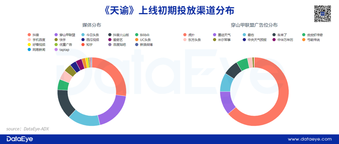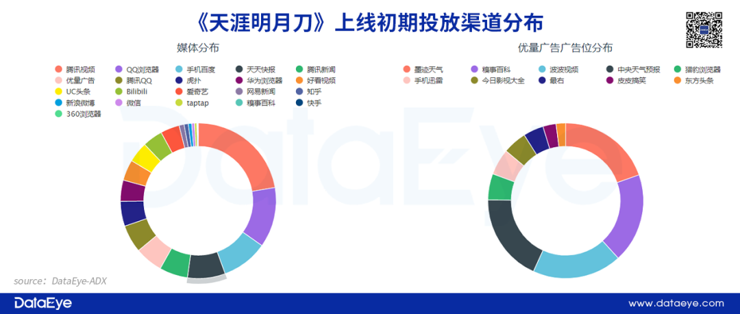 相比之下,無(wú)論是騰訊的《天刀》還是網(wǎng)易的《天諭》,在產(chǎn)品上線(xiàn)初期,投放渠道出現(xiàn)明顯的側(cè)重,例如網(wǎng)易《天諭》以字節(jié)系渠道為主,投放占比接近75%?!短斓丁冯m然以騰訊系為主要投放渠道,但投放分布相對(duì)均勻。