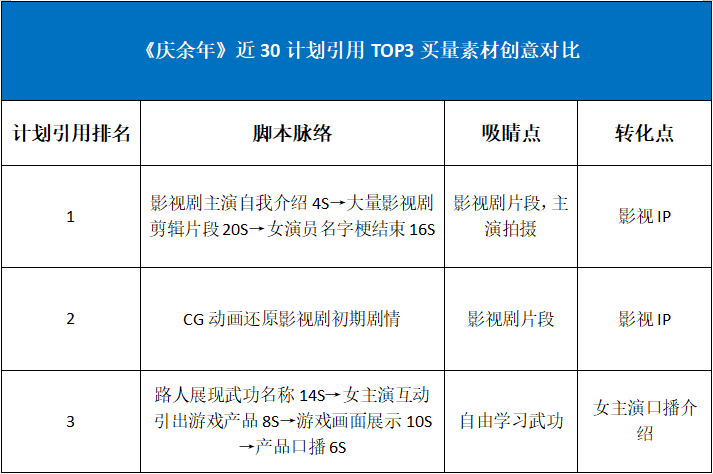 從創(chuàng)意素材來(lái)看:影視劇元素大量融入創(chuàng)意素材。通過(guò)DataEye研究院對(duì)《慶余年》近30天引用計(jì)劃數(shù)TOP3的創(chuàng)意素材進(jìn)行整理:
