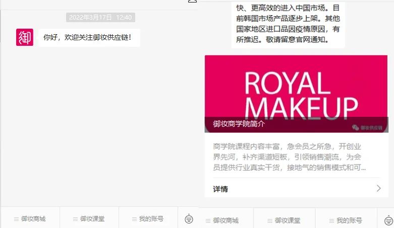 值得一提的是,C2CC傳媒記者在其公眾號發(fā)現(xiàn),還有御妝商學(xué)院的入口,據(jù)悉,該商學(xué)院的目的是為御妝供應(yīng)鏈的會員,提供行業(yè)真實干貨,接地氣的銷售模式和可落地的執(zhí)行方案,以期配合供應(yīng)鏈平臺的優(yōu)勢,為實體店零售實現(xiàn)流量、銷售等多層面的賦能,補(bǔ)齊渠道的短板。