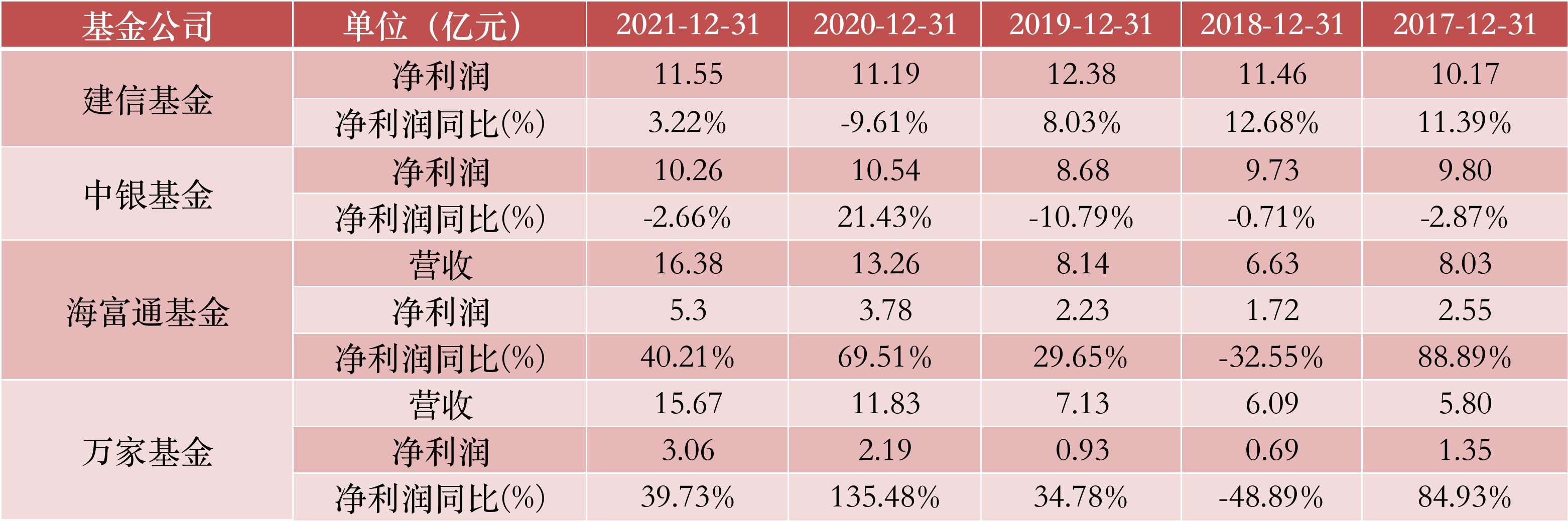 相比招商基金、交銀施羅德等賺得盆滿缽滿的同類銀行系基金,建信、中銀基金表現(xiàn)乏善可陳,2021年凈利潤分別為11.55億元、10.26億元,同比增長3.22%、-2.66%。另有幾家中小型基金公司則交出了一份不錯的成績單,海富通基金、萬家基金凈利潤為5.3億元、3.06億元,同比均增長近40%。