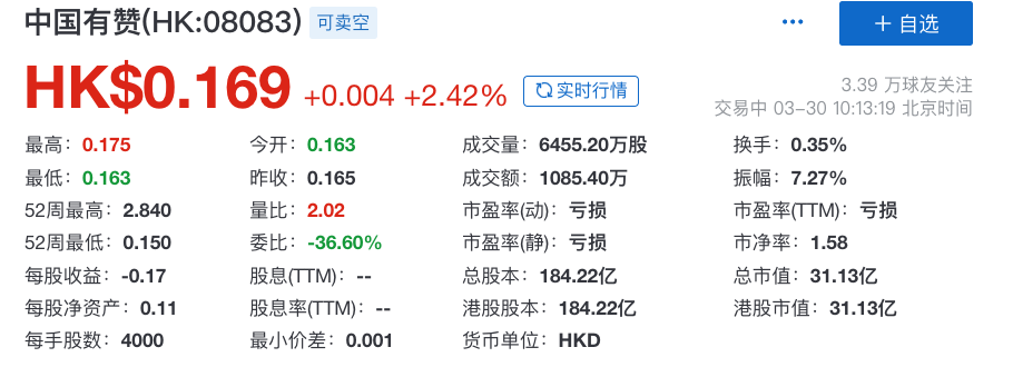 有贊的股價(jià)自2021年2月達(dá)到高點(diǎn)后一路下跌,跌幅超過(guò)96%,市值蒸發(fā)超700億港元。截至發(fā)稿前,股價(jià)0.169港元,市值31.13億港元。