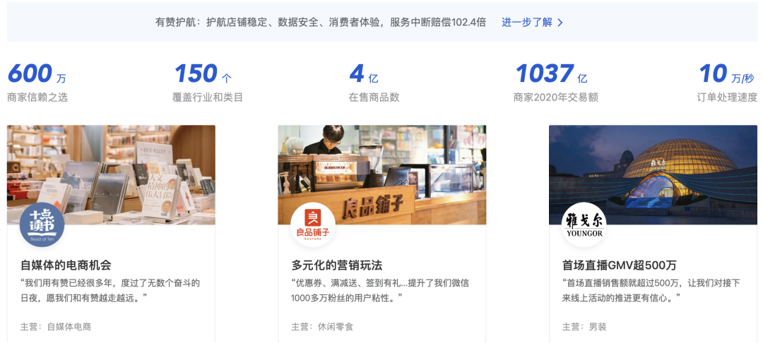 有贊的Slogan(標(biāo)語(yǔ))寫(xiě)著“做生意,找有贊”。據(jù)其官網(wǎng),有贊積累了600萬(wàn)商家,2020年商家交易額1037億元。良品鋪?zhàn)?、雅戈?duì)?、韓都衣舍都曾是它的客戶。