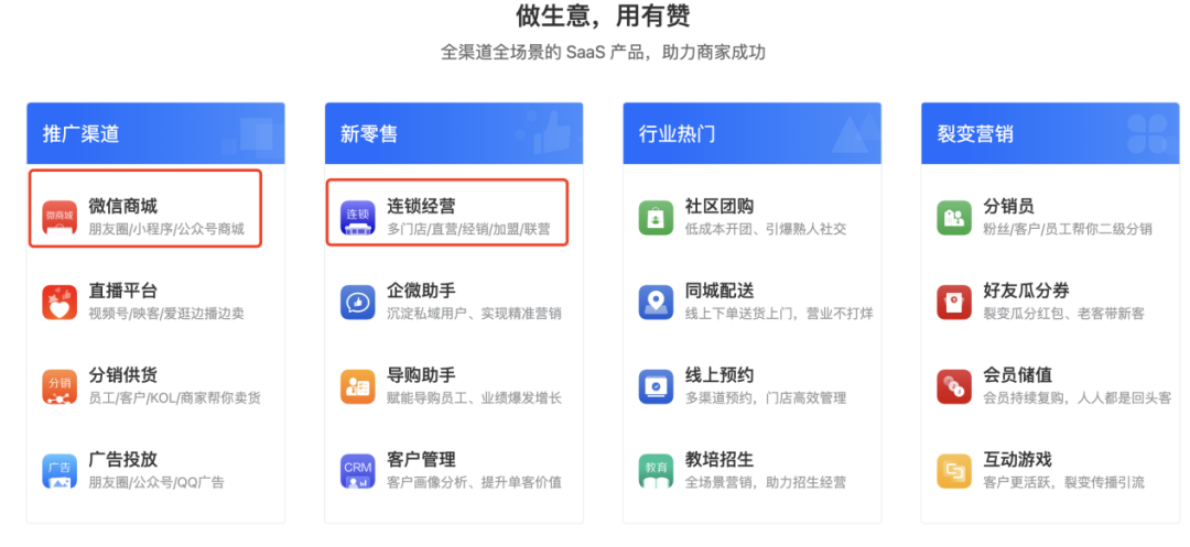有贊的產(chǎn)品介紹頁(yè)面上,主要產(chǎn)品有十多種,包括有贊微商城、有贊零售、有贊連鎖、有贊美業(yè)和有贊教育。但其實(shí)最核心的業(yè)務(wù)只有兩塊,分別是“有贊微商城”和“有贊連鎖”。