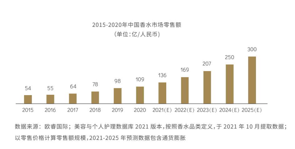 而據(jù)歐睿數(shù)據(jù)顯示,2021年中國香水市場整體增長達(dá)到了24.7%,并預(yù)測2021年開始到2025年中國香水市場的復(fù)合增長率將達(dá)到22.5%,預(yù)計到2025年,中國香水市場的整體規(guī)模將達(dá)到300億元。