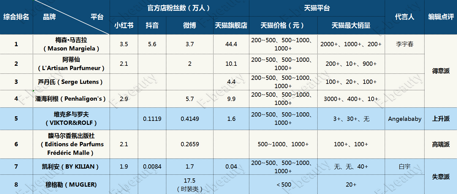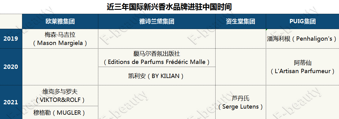 歐萊雅集團(tuán)于2019年和2021年分別引入梅森·馬吉拉(Mason Margiela)、維克多與羅夫(VIKTOR&ROLF)和穆格勒(MUGLER)到中國;雅詩蘭黛集團(tuán)于2020年引入馥馬爾香氛出版社(Editions de Parfums Frédéric Malle)、凱利安(BY KILIAN)到中國;資生堂集團(tuán)于2021年引入蘆丹氏(Serge Lutens)到中國;PUIG集團(tuán)于2019年起陸續(xù)引入潘海利根(Penhaligon's)、阿蒂仙(L'Artisan Parfumeur)到中國。